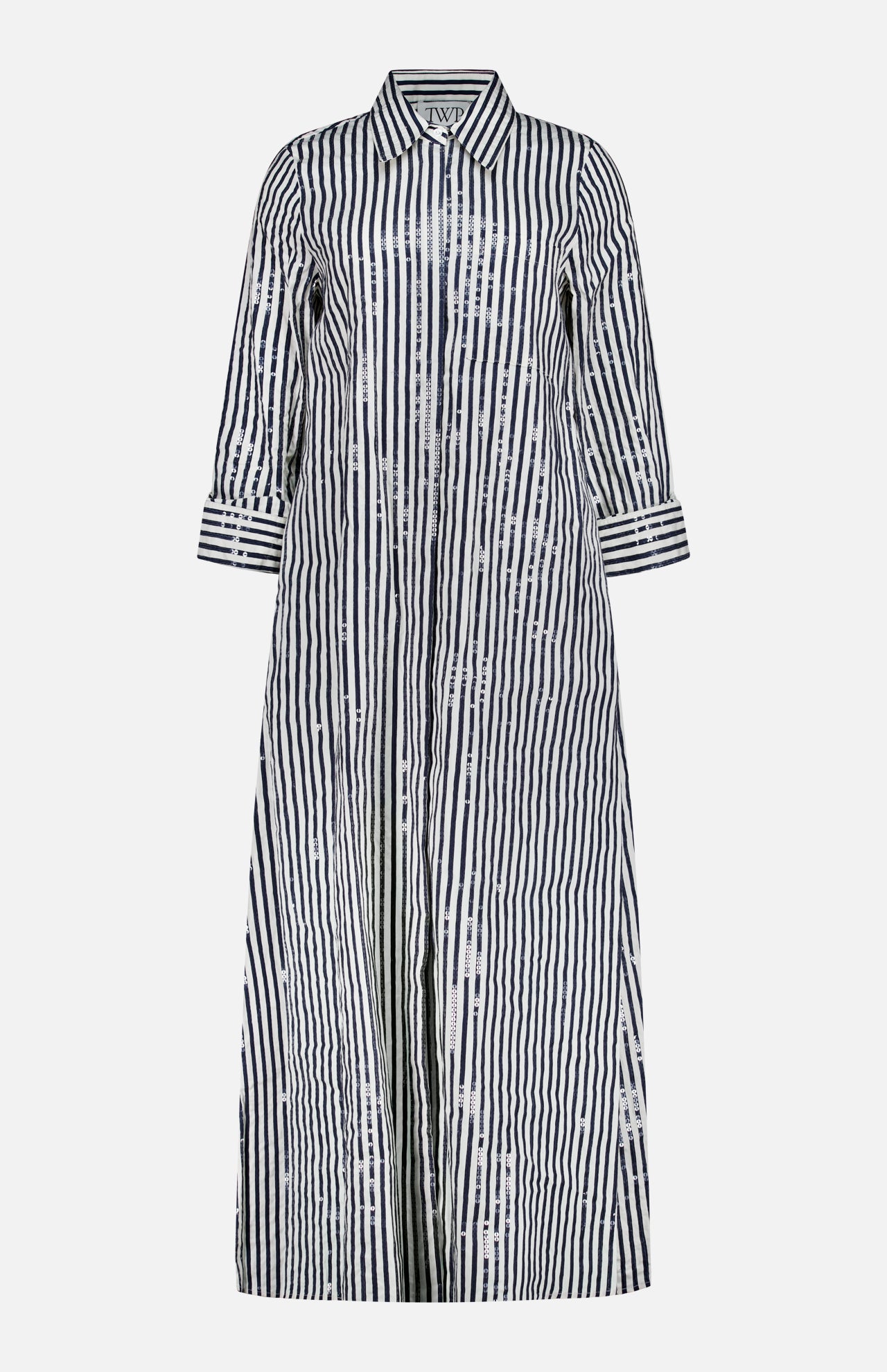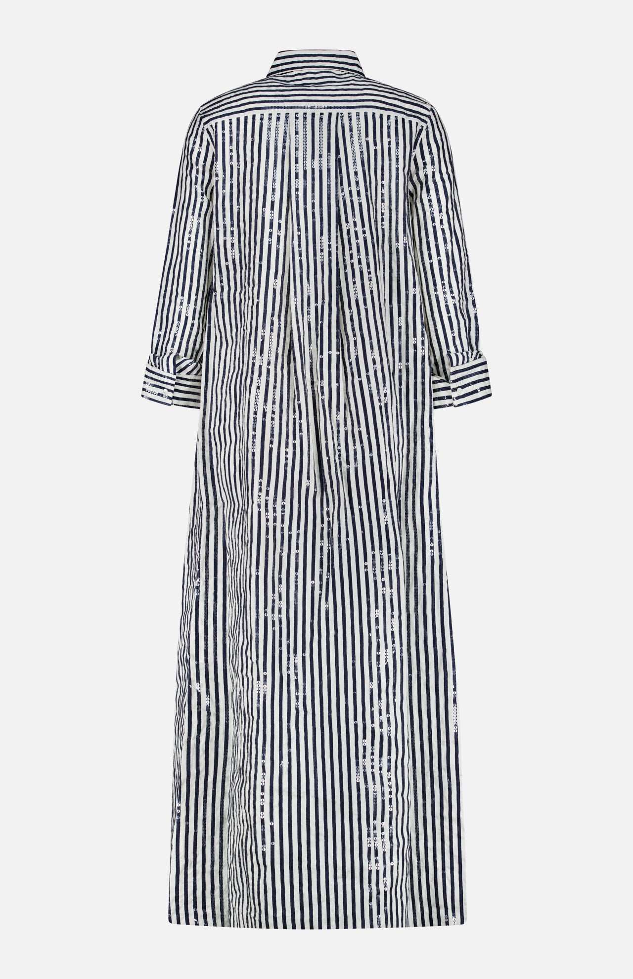 A fresh take on workwear for women, this seriously cool, oversized maxi shirt dress is made from Italian cotton shirting embellished in clear sequins on the indigo stripe. It makes for a playful piece that you can still wear to work for a tailored polish. You can expect a relaxed, A-line silhouette on this piece that asks: why not rock clear sequins for some daytime sparkle?