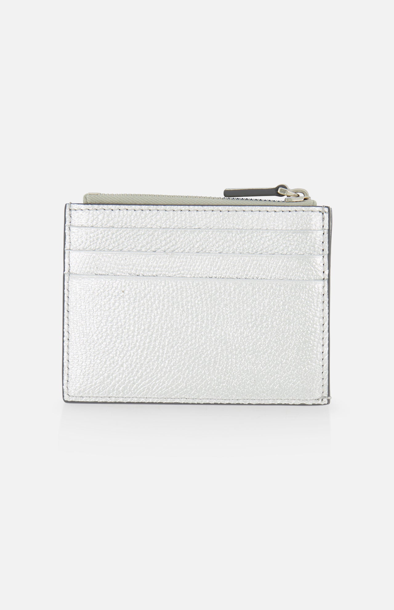 The day’s travels and purchases are made easy with the right accessories. This leather card holder features a front logo, zipper closure and numerous card slots, all in a festive silver tone. Ideal for storing in a larger bag, this small wallet keeps currency organized and easy to access.