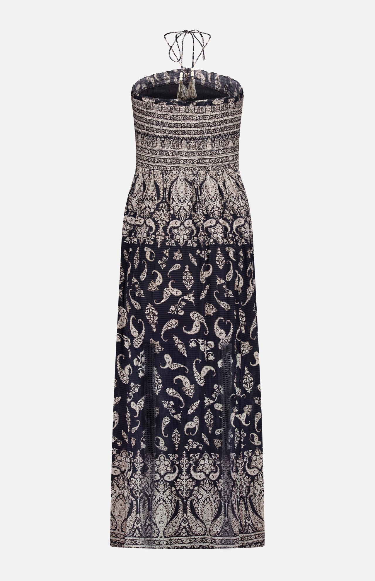 Play the part of free spirit when you wear this bohemian maxi dress. Indulge in throw-on-and-go ease in a lightweight and breathable material with an all-over paisley print in black and beige. A smocked, ruffle-trimmed bodice with bead and tassel halter straps define the shape while a full A-line skirt adds breezy movement.