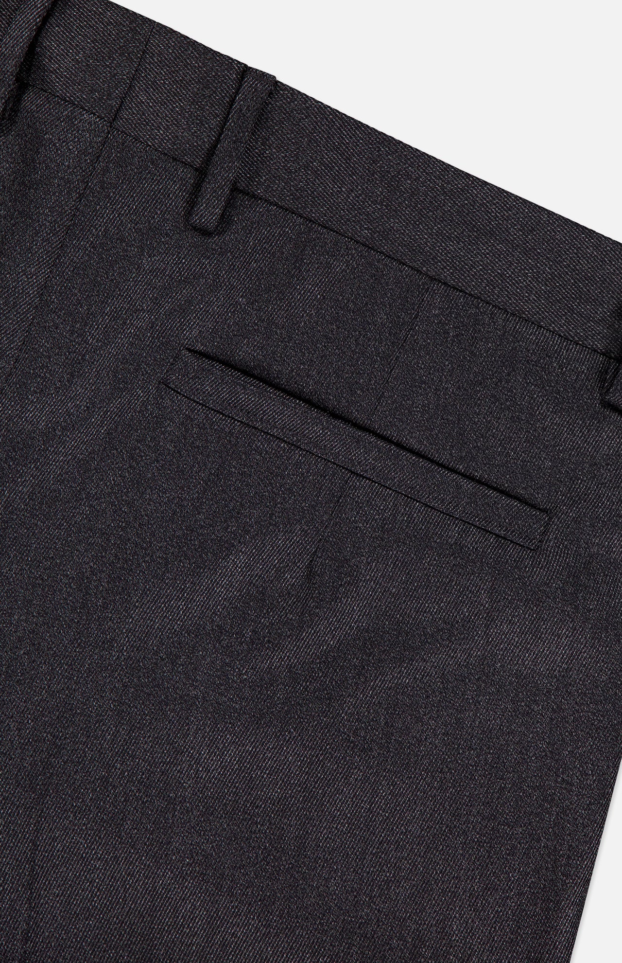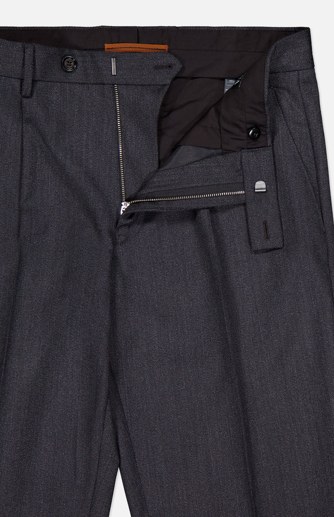 Discover a world of tailoring with these dark grey trouser pants. You can expect a pleated fit in pure wool for warmth, durability and comfort in a lightweight fabrication. A clean silhouette, this dress pant is a staple for the professional man and takes you from desk to dinner and beyond (like speakeasy basement cocktail lounge.