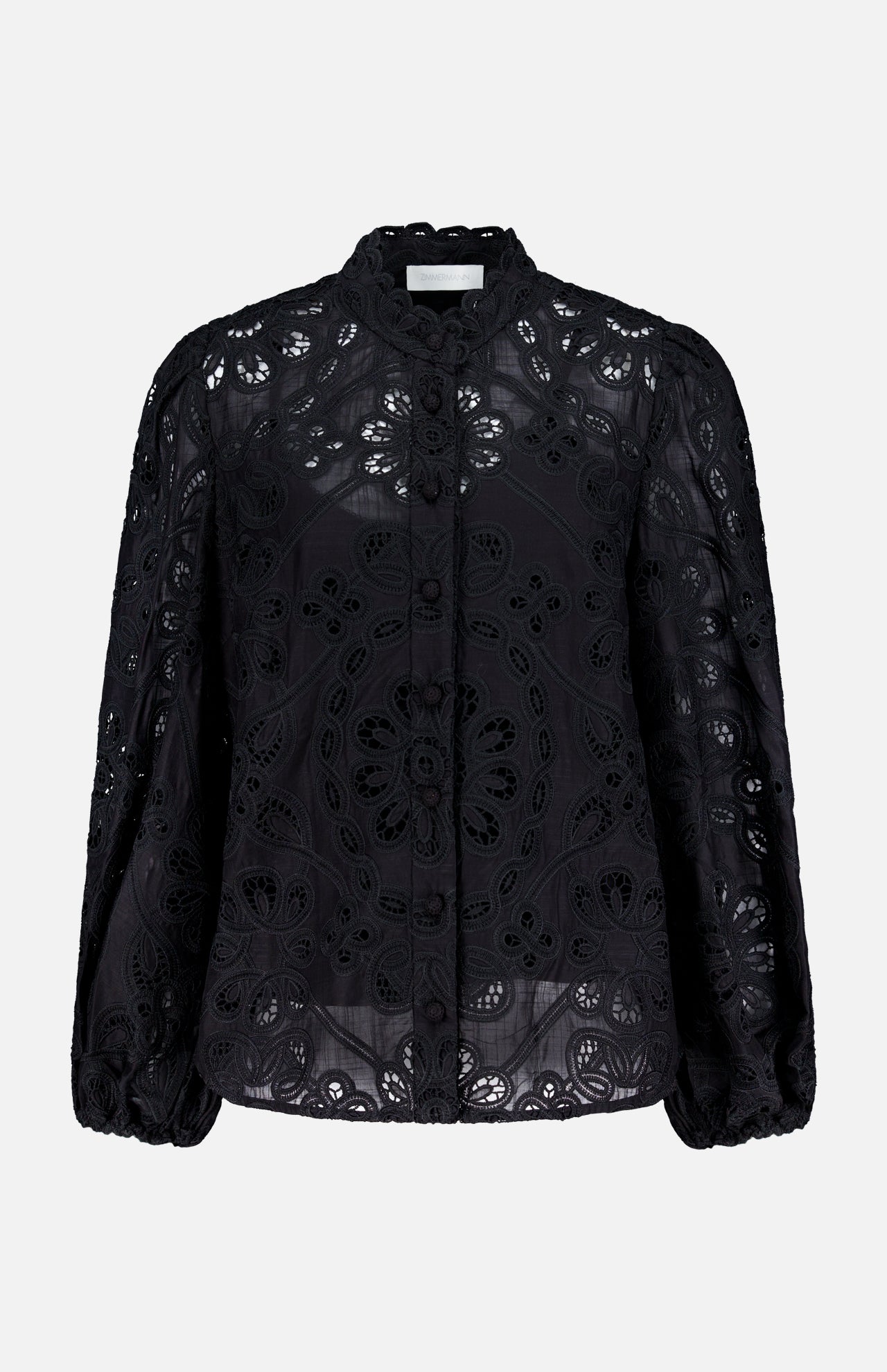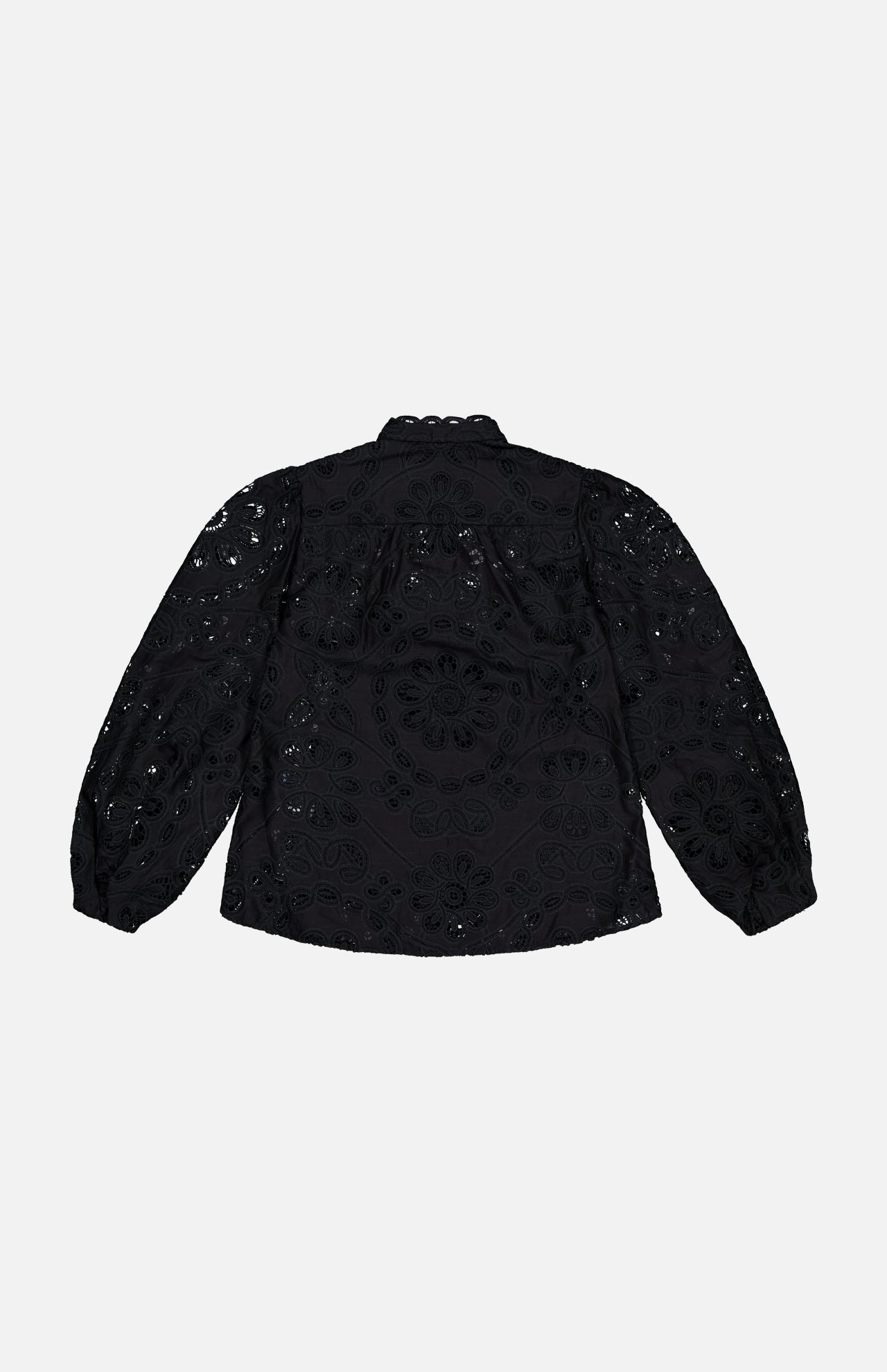 A feminine blouse fixes it. Fashionable and elegant, this black cotton blouse offers a relaxed fit and features an embroidered design for an artful approach to dressing. Highlights include a scalloped collar and long blouson sleeves with gathered cuffs as well as crochet buttons at the front closure. It comes with an interior camisole.